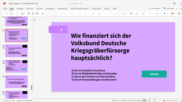 So gibt es dann verschiedene Bilder, zu denen die Jugendlichen gefragt werden, was sie damit verbinden (beispielsweise Bilder von Naturlandschaften, brennenden Städten, Soldaten, streitenden Personen etc.). Insgesamt gibt es sechs verschiedene Kategorien mit jeweils acht Fragen. Beantwortet man die erste Frage richtig, erhält man (symbolisch) eine Friedenstaube, bei acht korrekt beantworteten Fragen innerhalb einer Kategorie gibt es acht Friedenstauben. Ziel des Spiels ist es, möglichst viele Friedenstauben zu gewinnen, sprich möglichst viele Fragen korrekt zu beantworten. Die Kategorien lauten dabei: „Pictures“, „Schätz mal“, „Schlaumeier“, „Und wir?“, „Schön gesagt“, und als letzte Kategorie „Volksbund“. Gerade mit der letzten Kategorie zum Volksbund Deutsche Kriegsgräberfürsorge e. V. möchte die Gruppe erreichen, dass der Volksbund und seine Arbeit bekannter gemacht werden und sich auch junge Menschen mit ihm beschäftigen. So wird unter anderem in der Kategorie „Volksbund“ dann auch gefragt, welche Aufgaben der Volksbund habe, wie er sich finanziere, was sein Logo sei oder wann er gegründet wurde. Insgesamt umfasst das Spiel 106 Folien und ist damit ein sehr kurzweiliges, aber auch lehrreiches und interessantes Spiel.