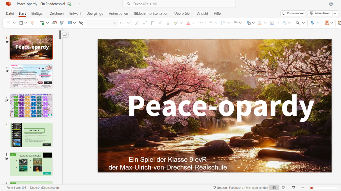 Unter der Anleitung der Konrektorin Dr. Svenja Meindl, Lehrerin für evangelische Theologie und Deutsch, haben insgesamt 18 Schülerinnen und Schüler der 9. Klasse (evangelische Religion) einen sehr originellen Beitrag eingereicht. Dabei haben sie in Anlehnung an die bekannte Quizshow „Jeopardy“ ein Quiz entwickelt, dass sich vorrangig dem Thema Frieden und seiner Bedeutung für die Schüler widmet. Entsprechend heißt das Spiel „Peace-opardy“. Das Spiel ist in einer Powerpoint-Präsentation erstellt. Damit soll es laut den daran beteiligten Schülern „universell einsetzbar“ sein, z. B. auch an anderen Schulen, um möglichst viele Jugendliche zu erreichen. Das Spiel solle aber nicht in der online-Version gespielt werden, sondern in einem digitalen Endgerät im Programm Powerpoint geöffnet werden, damit alle seine Funktionalitäten gegeben sind.