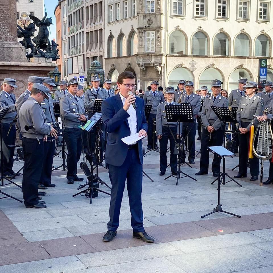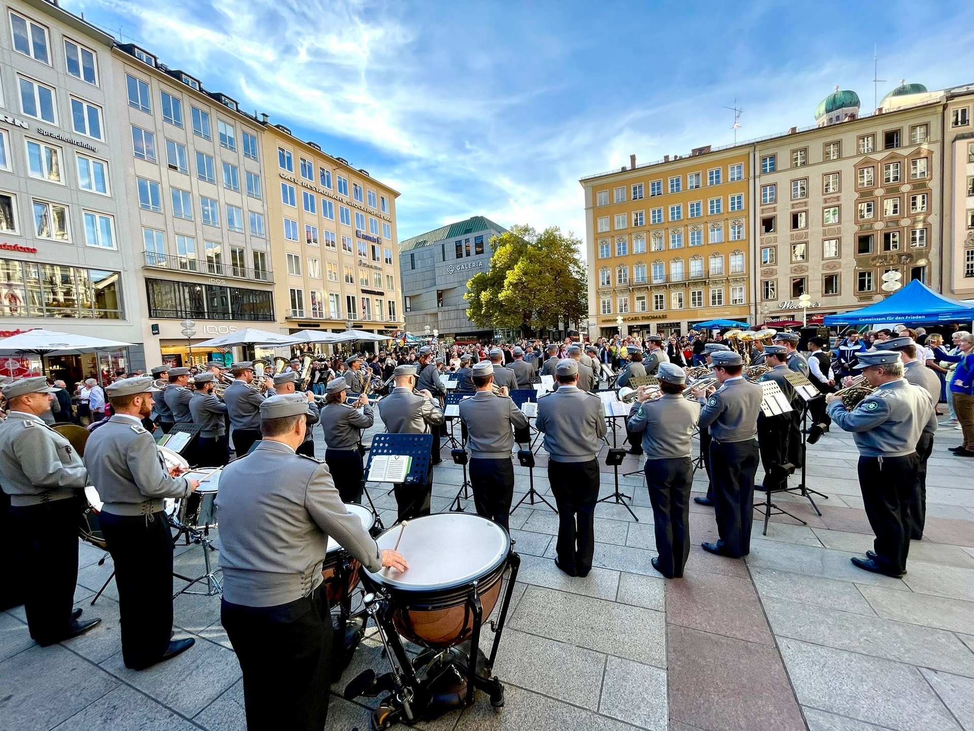 Es war eine wahrhaft beeindruckende Veranstaltung am 17. Oktober 2022 im Herzen unserer Landeshauptstadt München. Auf dem Marienplatz drängten sich unzählige Menschen und verweilten bei unserem einstündigen Standkonzert mit einem großartig aufgelegten Gebirgsmusikkorps aus Garmisch Partenkirchen unter der Leitung von Hauptmann Rudolf Piehlmayer. Die mitmoderierten Informationen zur Friedensarbeit unseres Volksbundes wurden interessiert aufgenommen und unsere prominenten Sammler aus der Politik und Bundeswehr, dem Reservistenverband und Traditionsvereinen freundlich bedacht.